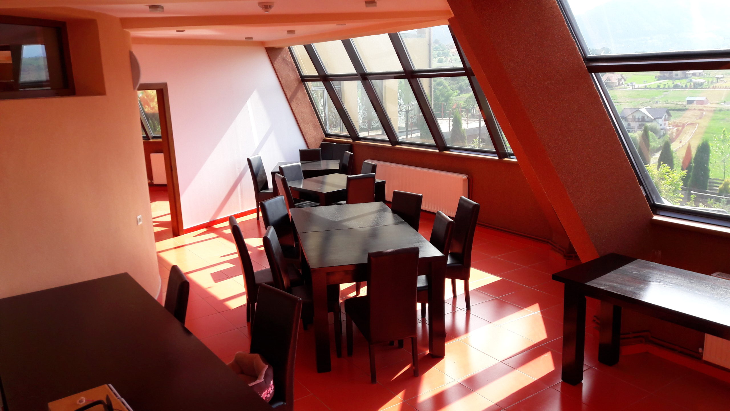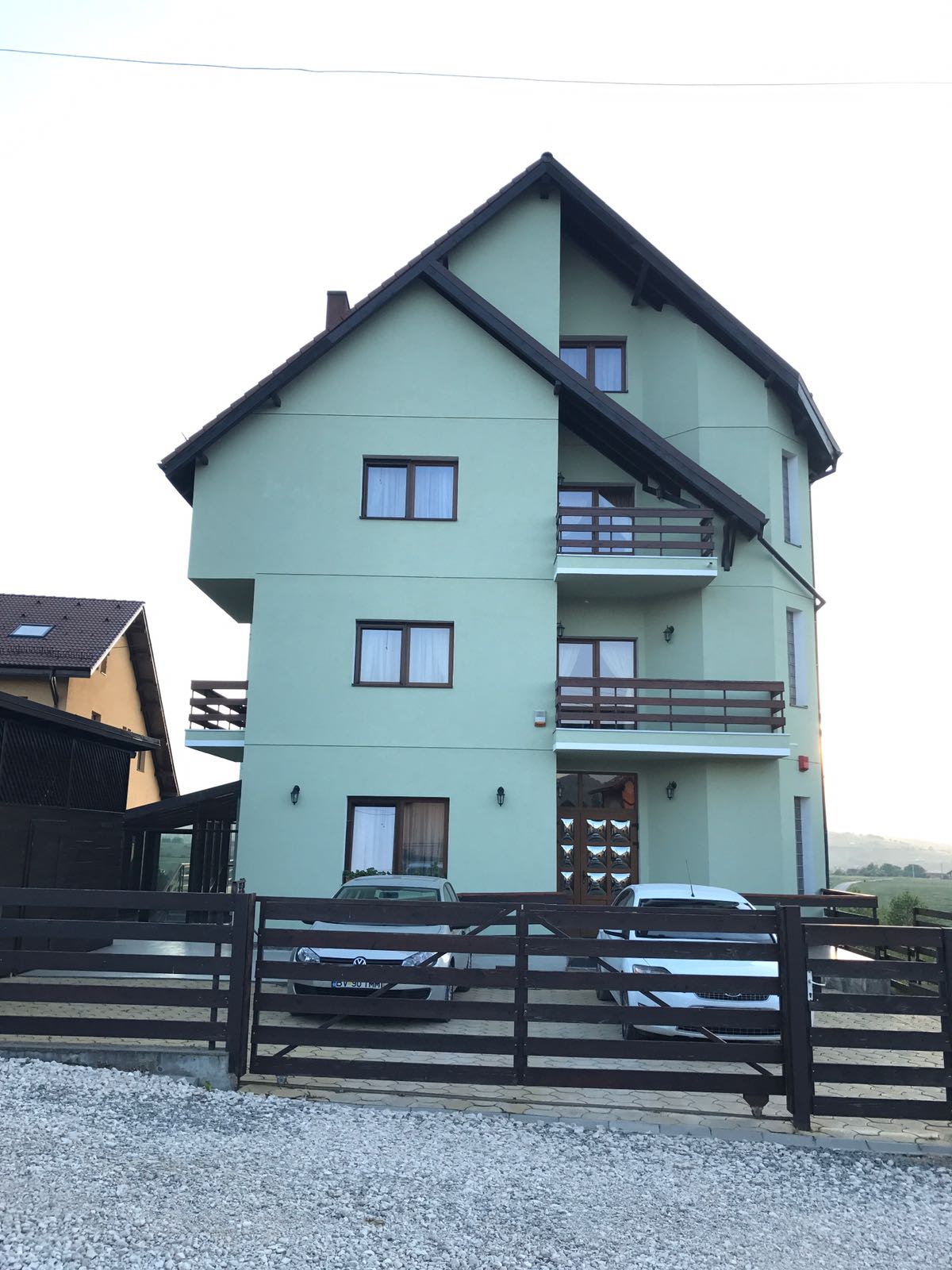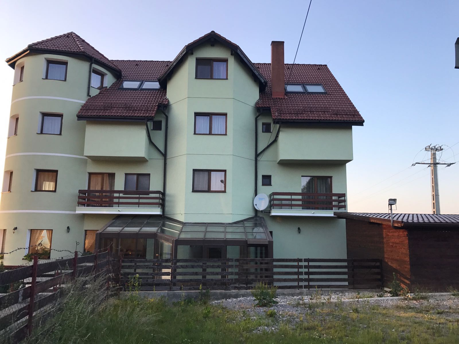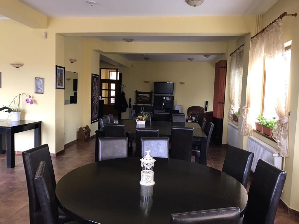 Vila D+P+2E+M situata la intrarea in satul Sohodol dinspre Tohanul Nou,pe un deal cu o priveliste minunata spre muntii Piatra Craiului,Bucegi,Postavarul,cetatea Rasnov si magura Codlei,precum si spre rezervatia de ursi de la Zarnesti.Cladirea este construita pe un teren de 1440mp cu amprenta la sol de 231mp.Fundatiile sunt din beton armat,zidarie din caramida GVP portanta,termoizolatie din polistiren de 8cm,iar la mansarda vata minerala si rigips,acoperișul fiind confectionat din sarpanta lemn acoperita cu tigla Bramac.Burlanele si jgheaburile sunt din tabla zincata.Usile de la intrari si geamurile sunt din tamplarie PVC cu geam termopan,lafel si vindfangul care inchide scara exterioara dintre parter si demisol.La interior pardoseli din gresie la bucatarie,bai,sala gimnastica,sala de mese,sala de conterinte si scara interioara din fier forjat.Pardoselile din holuri si camere sunt din parchet pluristratificat.Compartimentarea cuprinde 12 camere cu suprafete intre 16 si 32mp(5 avand si balcon),fiecare cu baie proprie,telefon ,televizor,internet.La parter exista grup sanitar pe sexe pentru sala de conferinte. La demisol mai exista spatii de depozitare,magazie,spalatorie,dulap vestiar pentru personal, 2 grupuri sanitare cu dus,precum si camera centralelo unde sunt amplasate 1 centrala termica pe lemne de 80 kw( VIGAS),1 centrala pe peleti complet automatizata de70-100 kw(Hoval Biolyt),2boilere de cate 600 l care pot fi actionate si electric.Tot la demisol se afla amplasata pompa electrica pentru apa din rezervorul de 6000l amplasat in curtea de la intrare in pamint si racordat in permanenta la reteaua principala de apa(intra in actiune doar la sacadere de presiune sau in caz de avarie). Apele menajere sunt colectate intr-o statie de epurare proprie(TOPAS 32),cu filtrarea apei amplasata in interiorul proprietatii si cu decantor pentru grasimi.Alimentarea cu curent electric provine de la reteaua de medie tensiune cu transformator la limita proprietatii,exista si priza de curent trifazic.Puterea instalata este de 30kw iar absorbita de 20kw,fiind instalata si o priza de curent trifazic .La intrarea principala exista o curte pavata cu dale de piatra,in stanga acesteia fiind amplasata o magazie pentru aproximativ 100mst de lemn sau 30 t peleti,care pot fi aruncate, pe un jgheab din beton armat,direct in camera centralei.Tot in curtea din fata exista bransament de apa pentru pompieri.Curtea din spate este impartita in doua,si anume- o terasa pavata cu dale de piatra prevazuta cu un grill si banci de lemn,iar restul gradinii este tersata si amenajata cu doua leagane din lemn,spatiu pentru foc de tabara sau copt batal si arbusti ornamentali si fructiferi,existand si o cismea cu apa potabila..Vila este dotata cu mobilier,sala de gimnastica cu aparate.In bucatarie exista doua plite si cuptoare electrice.Exista instalatie de avertizare antiefractie cu senzori de miscare si alarma deincendiu cu senzori de fum precum si instalatie de supraveghere video atat pe holuri cat si in exterior.